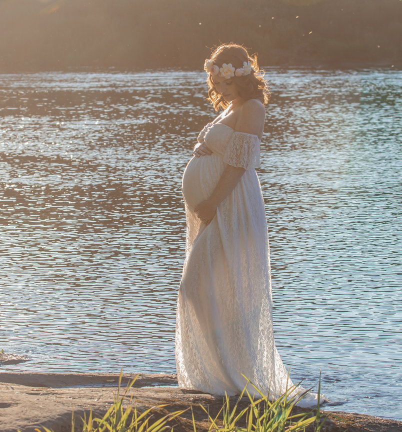 Pregnant woman in flowing dress by water
