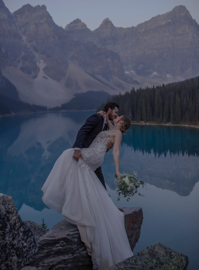 Couple embracing on a lakeshore with mountains behind